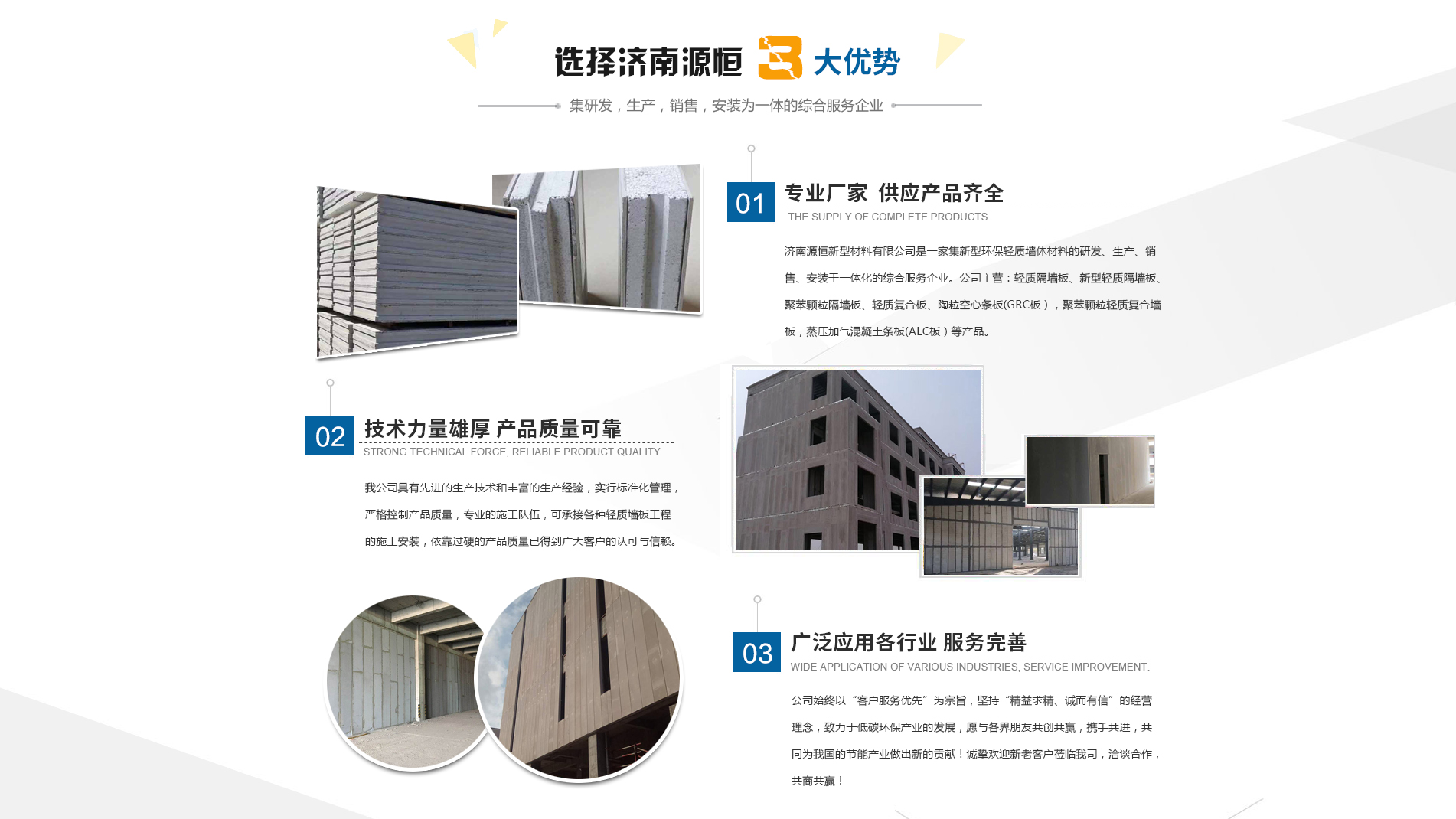 濟(jì)南源恒新型材料有限公司坐落于美麗的泉城濟(jì)南,是集新型環(huán)保輕質(zhì)墻體材料的研發(fā)、生產(chǎn)、銷售、安裝于一體化的綜合服務(wù)企業(yè)。我公司具有的生產(chǎn)技術(shù)和豐富的生產(chǎn)經(jīng)驗,為您提供輕質(zhì)隔墻板、新型輕質(zhì)隔墻板、聚苯顆粒隔墻板、輕質(zhì)復(fù)合板、陶粒空心條板(GRC板),聚苯顆粒輕質(zhì)復(fù)合墻板,蒸壓加氣混凝土條板(ALC板)等產(chǎn)品,本公司有專的施工隊伍,可承接各種輕質(zhì)墻板工程的施工安裝。輕質(zhì)隔墻板是國家推廣使用的新型輕質(zhì)、綠色無害建材,是墻改節(jié)能政策大力扶持的環(huán)保節(jié)能產(chǎn)品,是發(fā)達(dá)國家普遍采用的新型墻體材料。濟(jì)南源恒新型材料有限公司實行標(biāo)準(zhǔn)化管理,嚴(yán)格控制產(chǎn)品質(zhì)量,依靠過硬的產(chǎn)品質(zhì)量已得到廣大客戶的認(rèn)可與信賴。公司產(chǎn)品遍布各大城市,與國內(nèi)多家客戶建立了良好的合作關(guān)系。公司始終以“客戶服務(wù)優(yōu)先”為宗旨,堅持“精益求精、誠而有信”的經(jīng)營理念,致力于低碳環(huán)保產(chǎn)業(yè)的發(fā)展,愿與各界朋友共創(chuàng)共贏,攜手共進(jìn),共同為我國的節(jié)能產(chǎn)業(yè)做出新的...